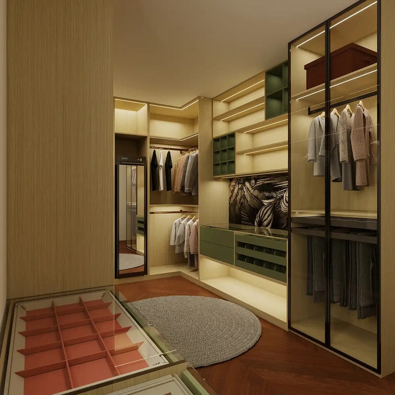 Modern Walk-In Closet Custom Wardrobe System|LED Lighting Closet Organizer|Glass Door & Wood Finish|Luxury Bedroom Closet Design
