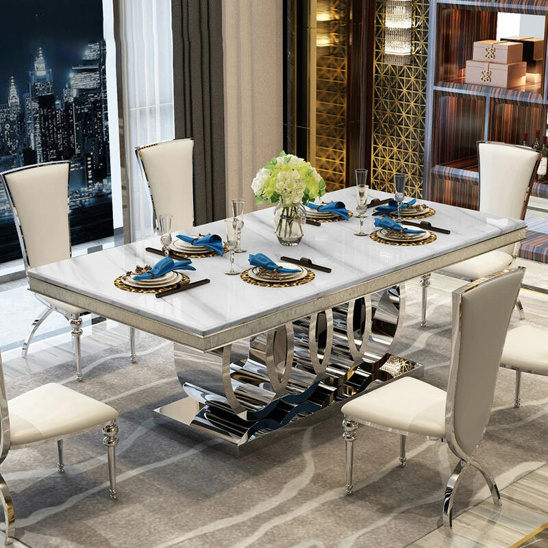 The marble tabletop flaunts unique natural veining—like soft Morandi - gray cloud patterns or ink - wash starry - sky textures. Paired with a matte or mirrored stainless - steel base, its clean lines and metallic allure blend seamlessly into styles from creamy - toned to luxury - modern. Even as an empty centerpiece, it doubles as art, effortlessly creating a high - end, atmospheric dining space.