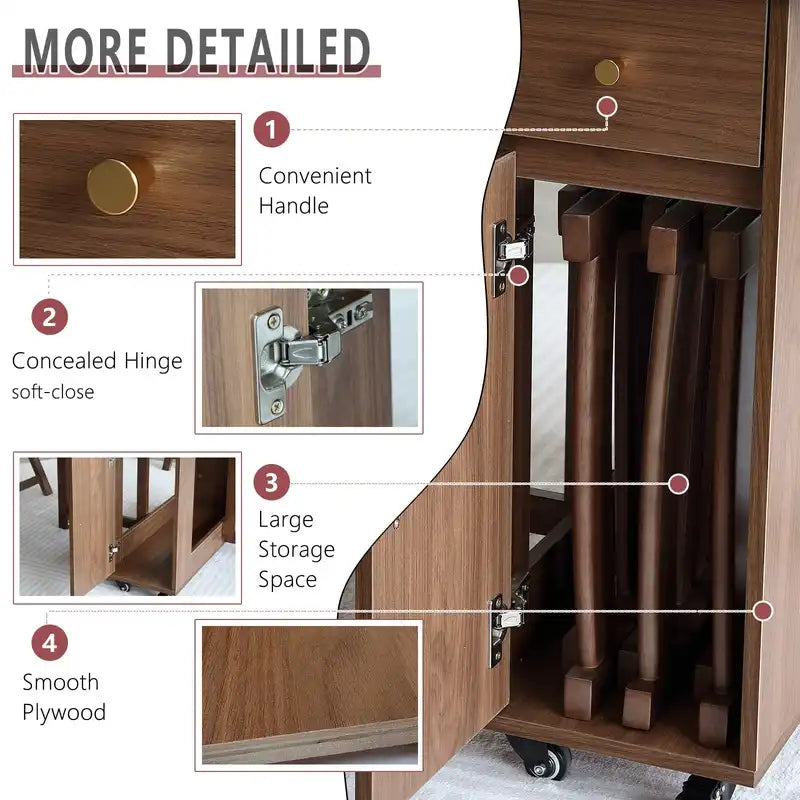 Four folding chairs store inside the cabinet with a smooth-glide drawer above, creating a compact console that moves easily and frees up floor space when not in use.