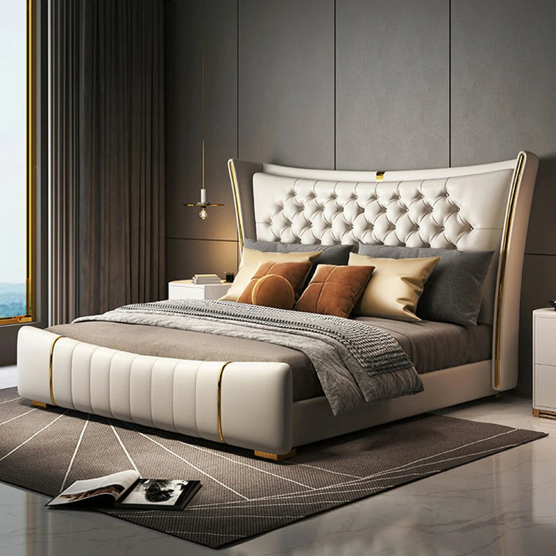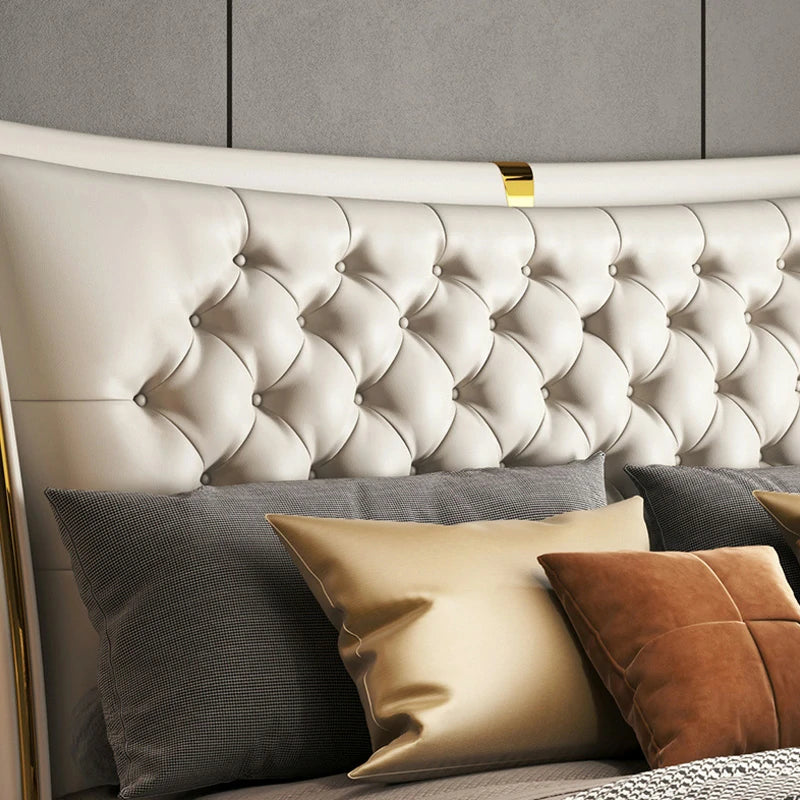 Los sutiles detalles dorados a lo largo del marco y la cabecera brindan un toque de glamour sin opacar el diseño limpio y moderno.