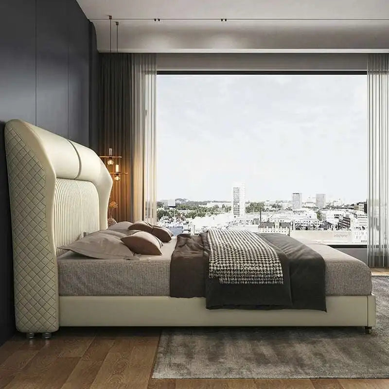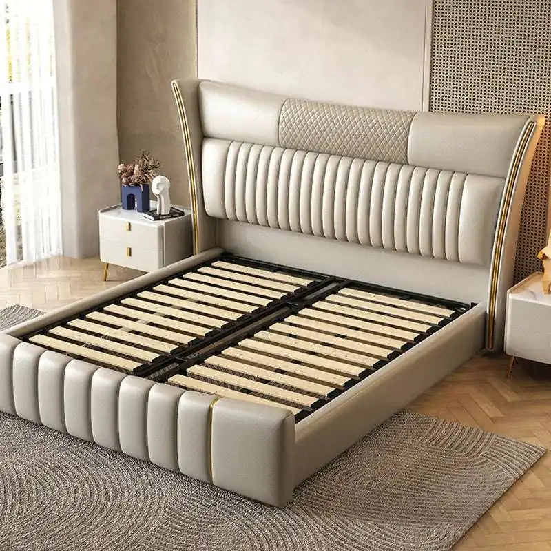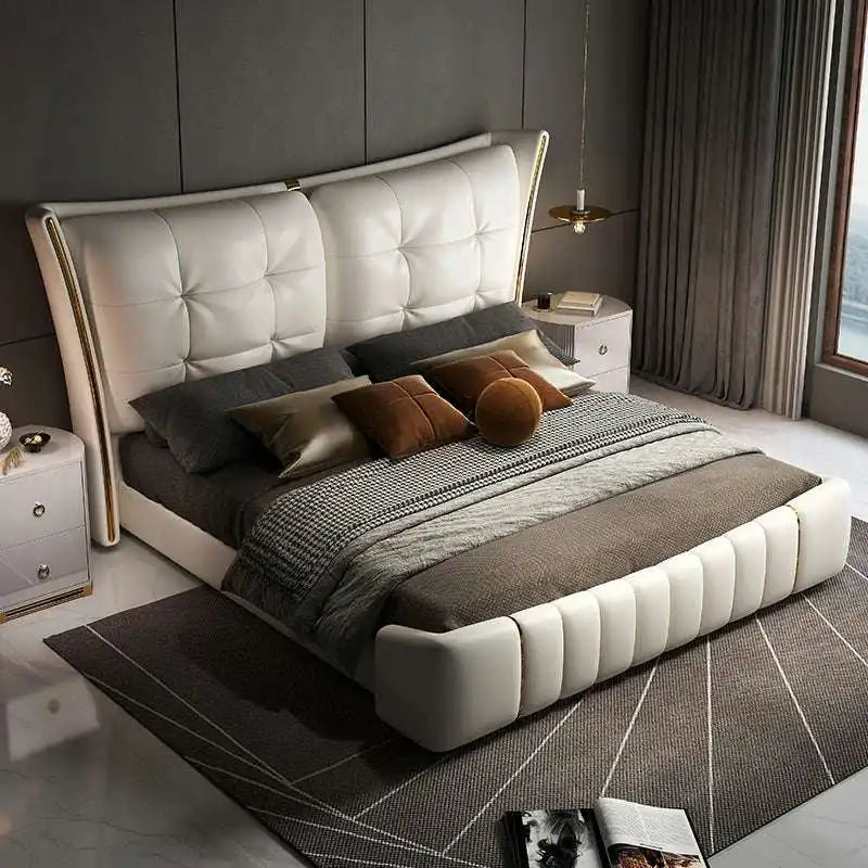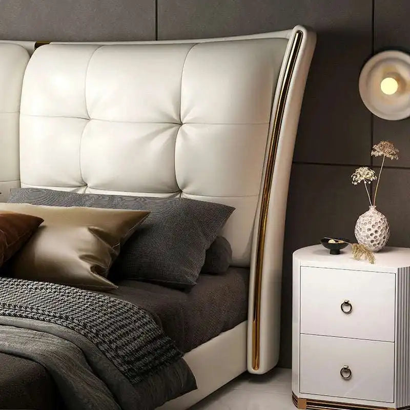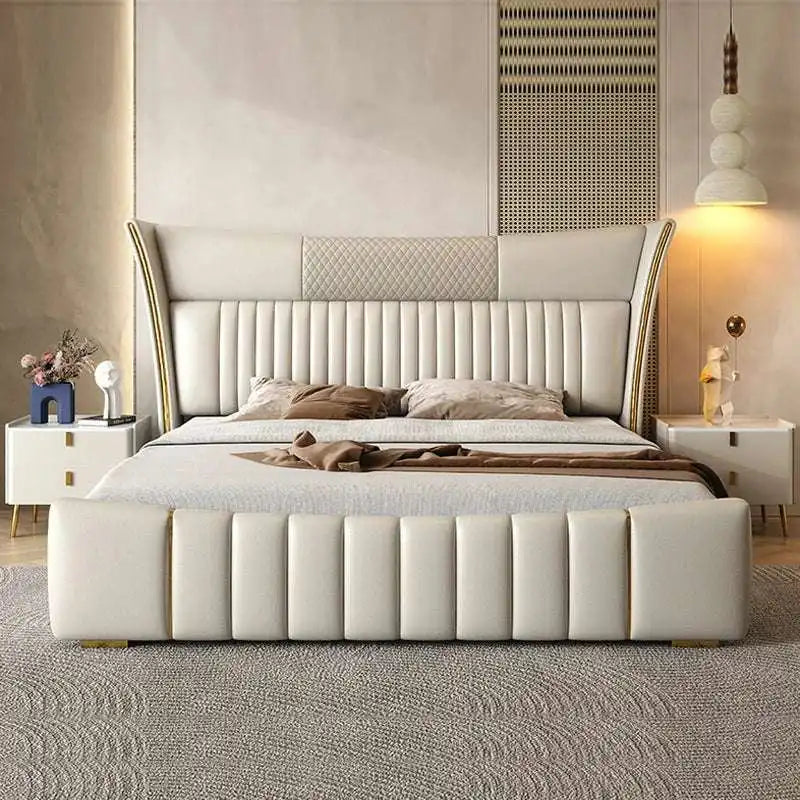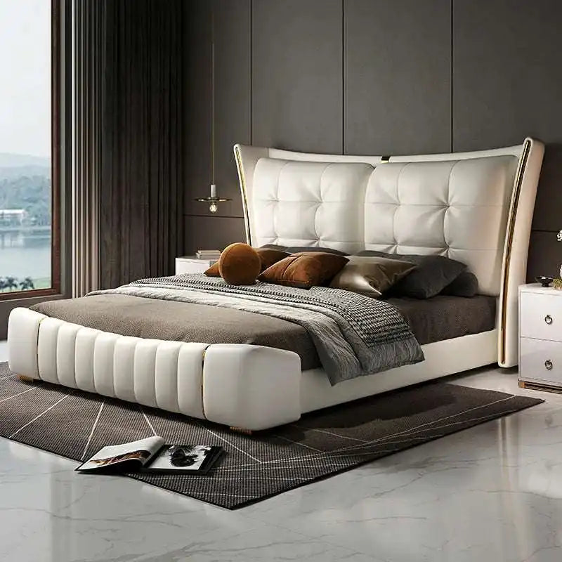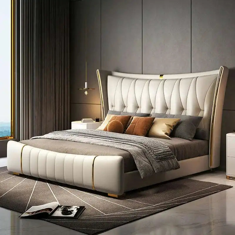 Cama King con respaldo alto: Estructura de cama moderna de cuero, diseño elegante