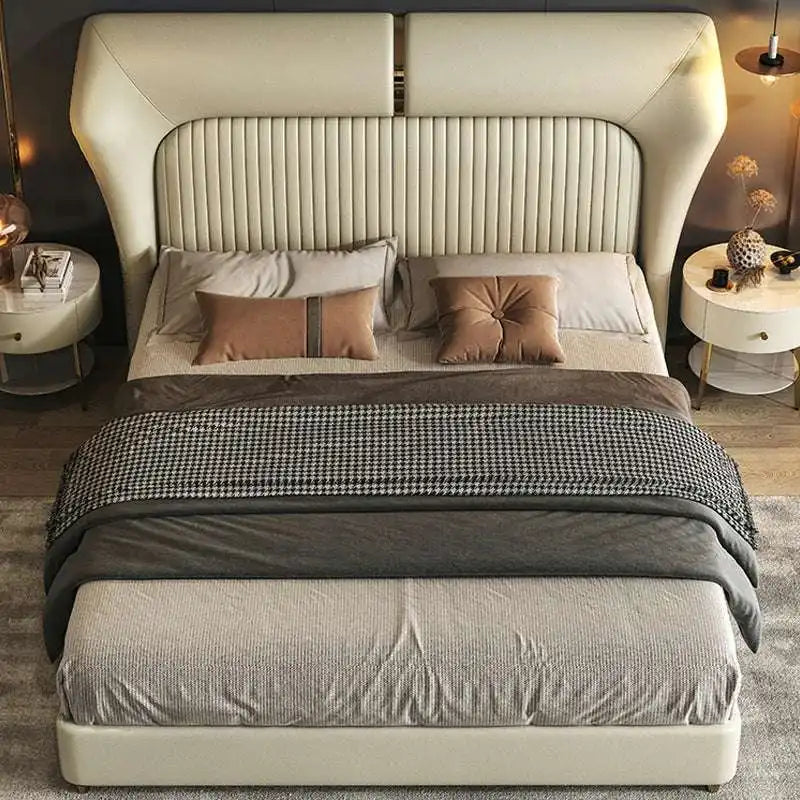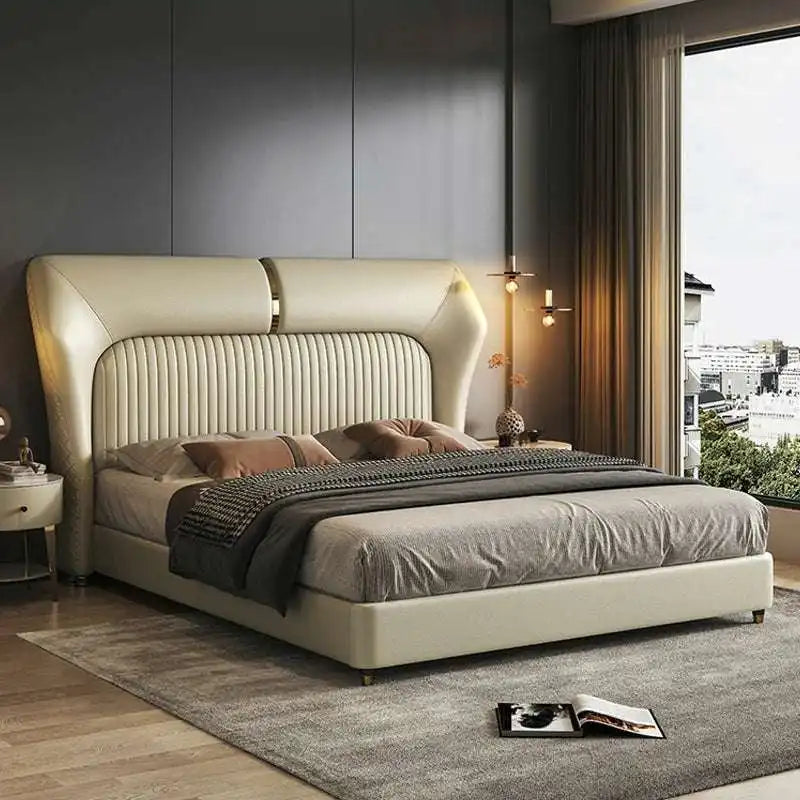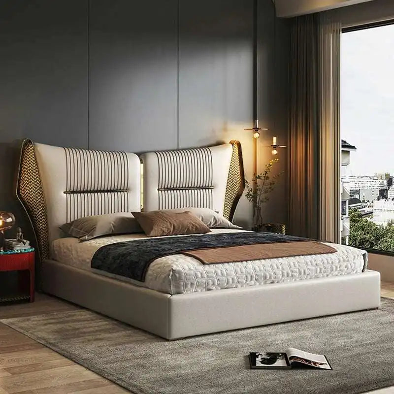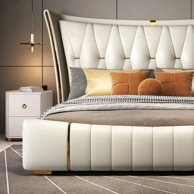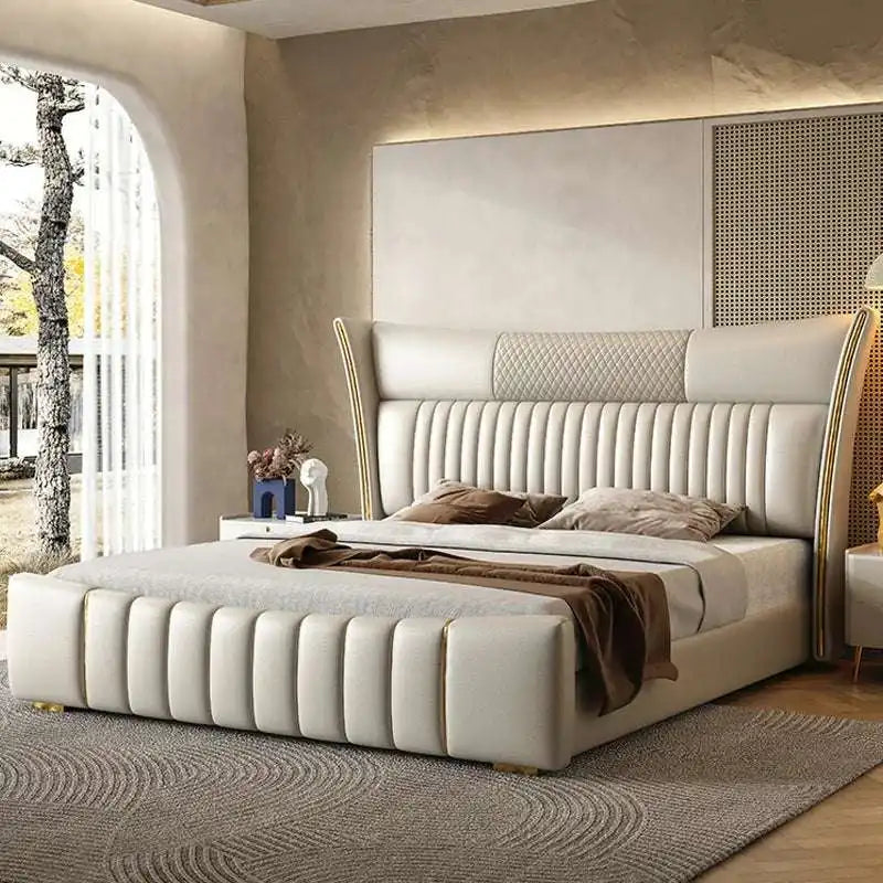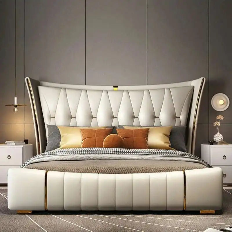 Cama King con respaldo alto: Estructura de cama moderna de cuero, diseño elegante